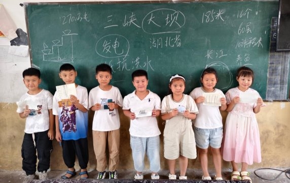 随后,实践队员梁卫飞以三峡大坝为引,讲述了三峡大坝的建设历程、结构组成、核心功能,并用视频与图片向孩子们展示了三峡大坝的全貌和“货船的电梯”船闸、“大号陀螺”水轮机等组件以及泄洪放水时的壮观场景,孩子们被三峡大坝的壮观与雄伟深深吸引,不断发出感叹:“三峡大坝的水库有我们20个长智镇那么大啊!”紧接着,梁卫飞用简单易懂的话为孩子们讲解了简易大坝的工作原理,并用粉笔、纸盒、橡皮等简单工具演示了简易大坝的工作过程,孩子们在认真观看后,纷纷表示他们也可以修一座小坝。