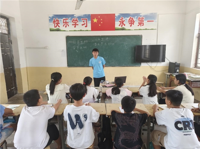随后,实践队员李东东为孩子们带来了一节“水生态”科普课。课堂开始,实践队员李东东先以几张水污染、冰川融化、土地龟裂等水生态被破坏后引发的惨状图片为引,向孩子们强调了水生态保护的重要意义。紧接着,李东东还以通俗易懂的语言为孩子们讲解了水循环和碳循环的概念与关系,拓展了他们的耦合机制以及与气候变化的关系,同时,他还为孩子们科普了水体富营养化这一概念。孩子们对新奇的生物与水生态知识深感兴趣,认真聆听,积极发问,深刻认识到水生态保护的重要性。