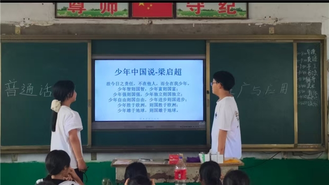 最后,实践队员郭文琰以“普语颂”的活动形式,鼓励孩子们上台朗诵,孩子们充满热情,跃跃欲试,从略显生涩到熟练,到最后能用标准的普通话为大家朗诵梁启超的《少年中国说》。“少年强则国强,少年……”大家在一言一语中形成了学习普通话的积极氛围。除了在课堂上、宣讲中进行示范和讲解,实践队员们还在课余时间与孩子们沟通,耐心地倾听孩子们的发音问题,对在学习普通话中存在困难的孩子们进行针对性指导。在孩子的眼中,实践队员们不仅是老师,更是他们学习普通话的引路人和朋友。