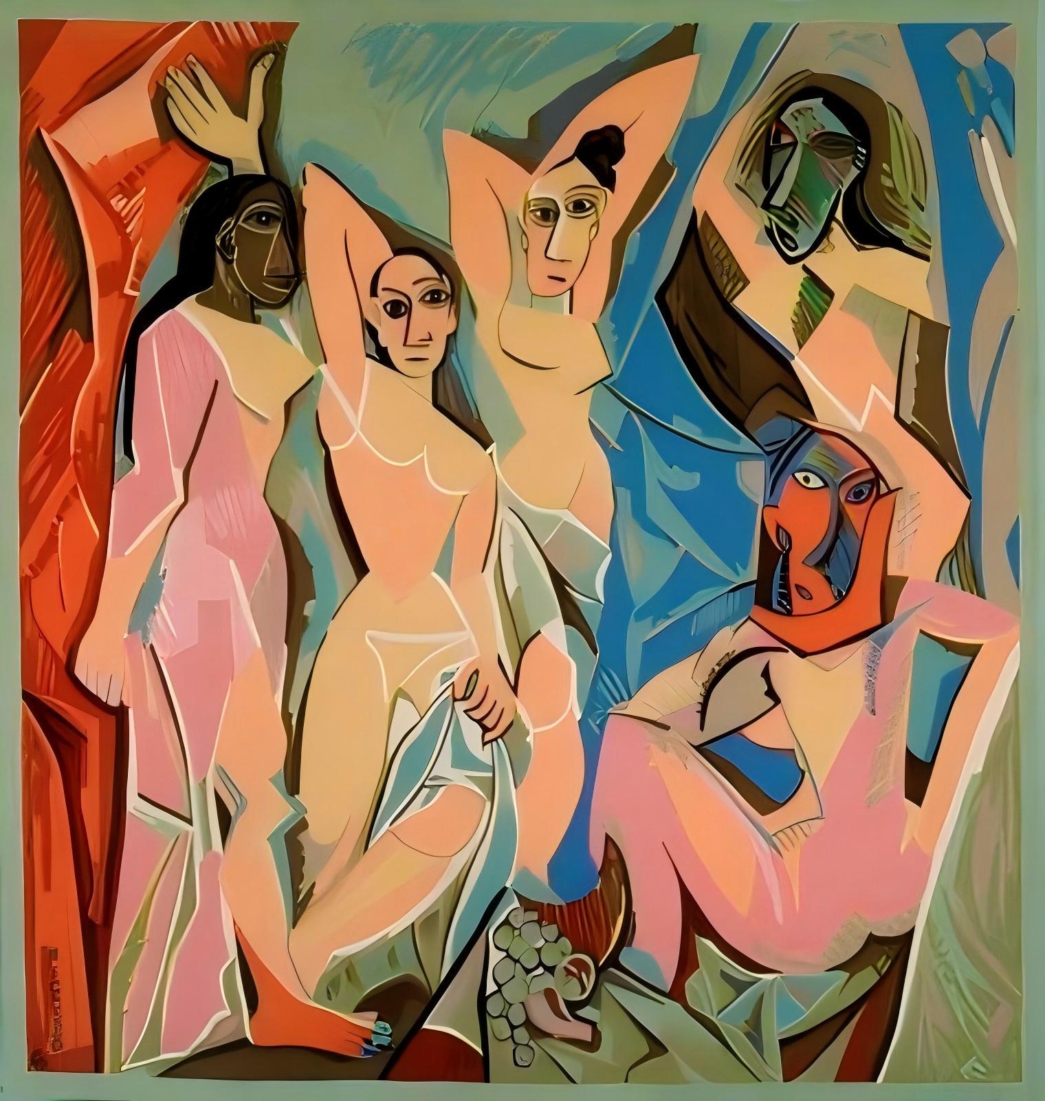 20世纪初叶,公元1907年,照相术已历经60年的发展。传统绘画难以与照相术相匹敌,必求新路。于是,毕加索的《亚威农少女》应运而生。这幅作品诞生于战乱、社会动荡与经济危机的前夜,以其扭曲的人物形象,彰显了打破旧世界、重塑新美学构想的勇气与坚定决心。它是西方现代艺术史上的一次革命性突破。如今,我们重新审视这幅杰作,发现它与同时代物理学家爱因斯坦的相对论相呼应,引领出现,其作品融合东西方艺术元素,突破传统绘画框架,用色彩和形了人类审美的新方向,预示着农耕文明的终结,并开启了20世纪新思想与新科技的曙光。